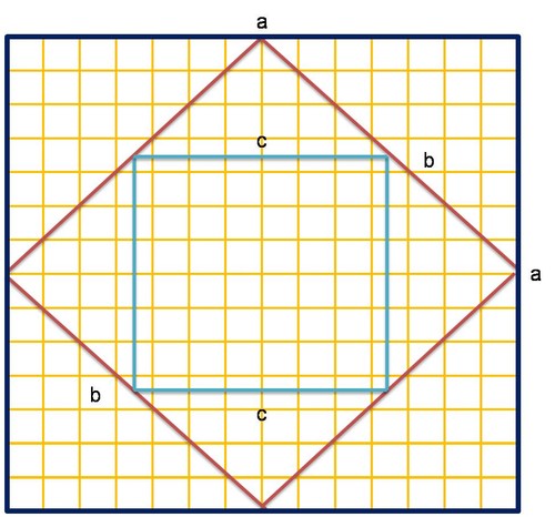 O Quadrado de lado "c" tem de lado 7 quadrículas unitárias. Logo, a sua área é 72 = 49 unidades de área. Note-se que esta área é metade da área do quadrado de lado "b" e quarta parte da área do quadrado de lado "a".