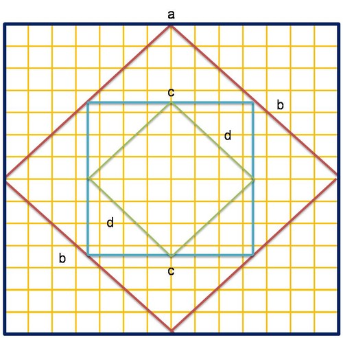 Em termos algébricos, e tal como a figura sugere, o comprimento do lado "c" é metade do comprimento do lado "a", isto é: c = a/2. Logo, o cálculo da área do quadrado de lado "c" é a seguinte: a/2 x a/2 = a2/4. Daqui conclui-se que a área do quadrado de lado "c" é a quarta parte da área do quadrado de lado "a". Logo 196 : 4 = 49 unidades de área.