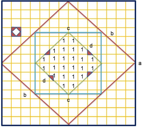 Note-se que conseguimos identificar 14 quadrículas inteiras, mais 10 por junção de quadrículas adjacentes, mais meia quadrícula que é a que resulta dos quatro triângulos assinalados a vermelho. Logo, a área da figura de lado "d" é 24,5 unidades de área.