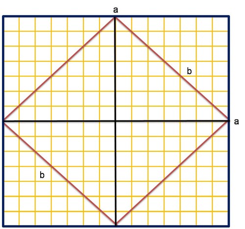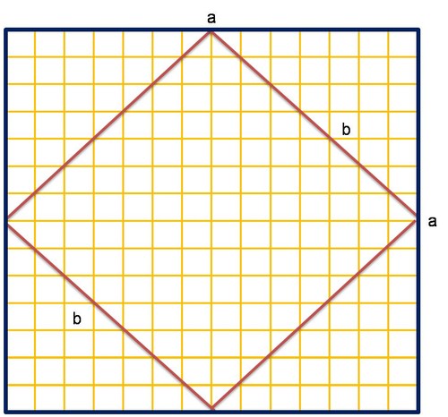 Note-se que a figura de lado "b" ocupa sempre metade de cada um dos quatro quadriláteros em que a figura de lado "a" foi decomposta. Logo, podemos concluir que a área da figura de lado "b" é metade da área da figura de lado "a", isto é, 98 unidades de área.
