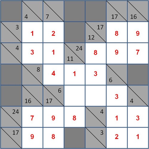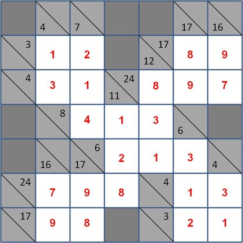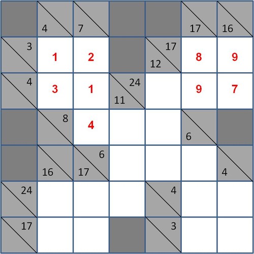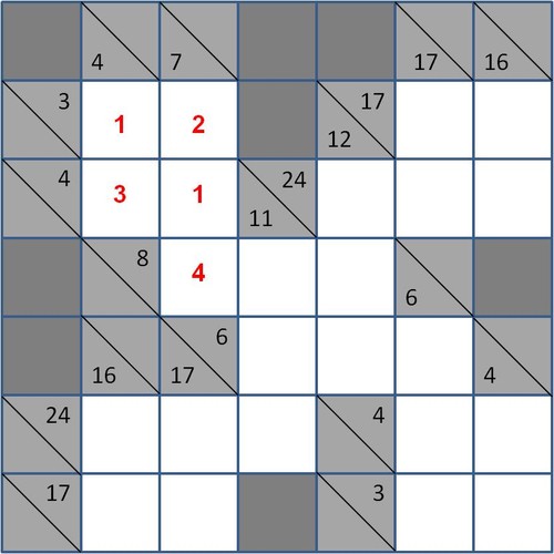 Restam apenas os quatro valores centrais. Estes estão dependentes simultaneamente de duas adições horizontais cujas somas são, respectivamente, 8 e 6, bem como de duas adições verticais cujas somas são, respectivamente, 11 e 12. No caso da soma horizontal de valor 8 já existe uma parcela de valor 4, faltando apenas o preenchimento de duas parcelas cujo valor total terá de ser também 4. Não se podendo repetir o valor 2, pode optar-se por se colocar o valor 1 e o valor 3: