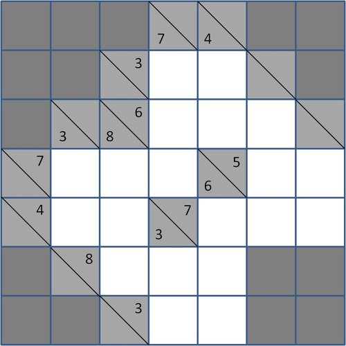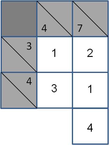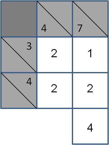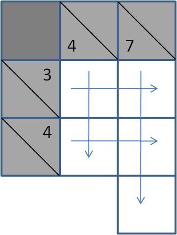 As setas indicam o sentido em que estas células têm de estar afectas aos números "pista" que são fornecidos. Sendo assim, a seta superior horizontal indica que as duas células que estão à direita do valor 3 terão de conter dois números naturais não repetidos, cuja soma seja 3. Por sua vez, a seta horizontal de baixo indica que as duas células à direita do 4 terão de ser preenchidas com dois números naturais, diferentes entre si, cuja soma seja 4. Contudo, o desafio de se preencherem estas quatro células não pode deixar de ter em consideração as setas verticais, isto é, a seta vertical da esquerda indica que por baixo do valor 4 terão de ser colocados dois números naturais diferentes entre si, cuja soma seja 4. Por sua vez, a seta vertical da direita indica que as tês células existentes por baixo do 7 terão de ser preenchidas por três números naturais diferentes entre si, cuja soma será precisamente o valor 7.