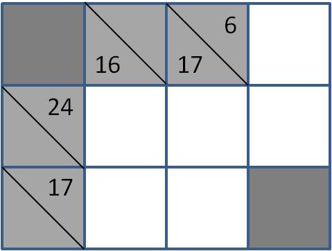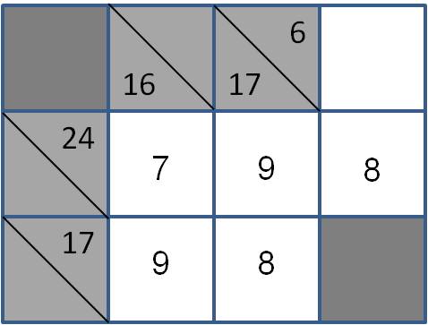Continuando, facilmente se percebe que em termos de raciocínio aritmético se deve afectar o valor 8 à soma 24. Por outro lado, a quadrícula do canto inferior direito também é de fácil preenchimento: