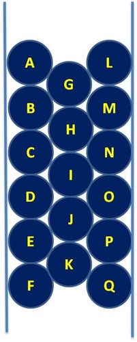Sendo assim, poder-se-á reflectir acerca de como será a disposição dos objectos geométricos nas margens e na coluna centraldo rio, de modo a que o número de possibilidades de o atravessar coincida com o 10º número triangular. Qual a sua sugestão?