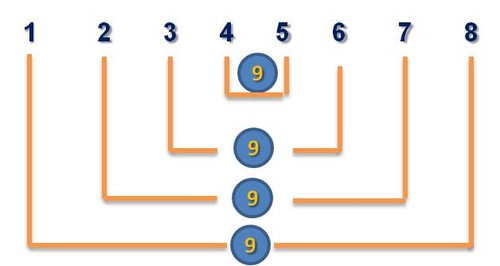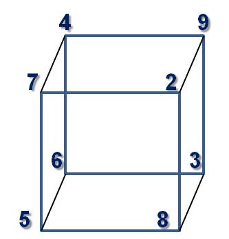 Logo, trata-se de um valor que deve ser dividido em duas partes iguais, uma vez que as duas faces opostas terão de originar a mesma soma numérica. Estamos a falar do valor 18. Por sua vez, este valor terá de ser obtido pela adição de quatro parcelas diferentes. Contudo, como cada par de números assentes em dois vértices adjacentes faz parte, ao mesmo tempo, de duas faces adjacentes, implica que a sua soma seja 9. Ora este conjunto de oito números permite que isso aconteça: