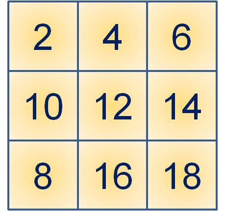 Como consequência imediata desta constatação, quis testar esta regularidade com os nove primeiros números pares (2, 4, 6, 8, 10, 12, 14, 16, 18). Foi então que sem qualquer tipo de esforço mental me limitei a distribuir estes nove valores nas respectivas posições da nova figura. Eis o resultado: