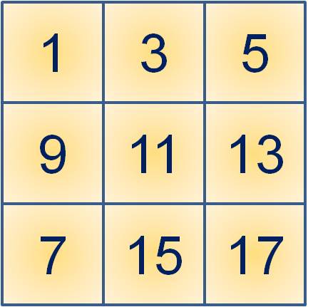 Porque sou muito curioso e tenho por hábito extrapolar as situações de que gosto de resolver a outros contextos, pensei para mim próprio se o desafio fosse colocado tendo em conta exclusivamente os nove primeiros números ímpares (1, 3, 5, 7, 9, 11, 13, 15, 17). Desafiei-me, então, com a seguinte figura: