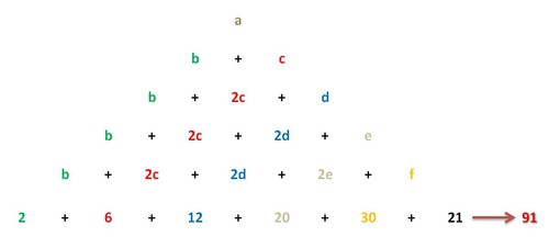A título de exemplo, vejamos o último caso, em que se adiciona um número oblongo ao dobro de um número triangular. Ora, uma vez que a lei que gera os números oblongos é [n x (n + 1)] e a lei que gera os números triangulares é (n2 + n) : 2, então da sua adição resultam os seguintes cálculos: