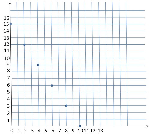 Vejamos o exemplo seguinte: {(0, 15); (2, 12); (4, 9); (6, 6); (8, 3); (10, 0)}. Que comentários poderemos fazer relativamente a este conjunto numérico?